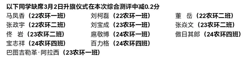 【通报】资源与环境学院3月2日升旗仪式缺席通报名单
