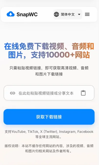 刷到喜欢的海外视频想保存反复看?听到神仙BGM想单独提取?找遍全网工具不是收费就是有套路?别愁!今天安利一款永久免费的宝藏在线工具,支持10000+主流平台,三步操作秒上手,轻松解决视频、音频、图片下载难题,自媒体人、学生党、普通用户都能用!刷到TikTok上的有趣短视频想存下来慢慢看,结果找了半天工具要么收费要么要注册?听到YouTube视频里的神仙BGM想单独提取,却不知道怎么操作?更别提那些下载过程中突然跳出广告、要求充值会员的套路——是不是每一个都戳中你的痛点?别担心,今天的宝藏工具就是来帮你解决这些问题的!这款工具简直是资源下载界的“万能钥匙”!不管是YouTube、TikTok、X(Twitter)这些海外热门平台,还是Instagram、Facebook的精彩内容,只要有链接,它都能轻松解析。高清视频(720p到4K任选)、背景音频、博主配图,一站式搞定所有下载需求,再也不用为不同平台找不同工具,一个顶十个,资源收集效率直接拉满!- 复制链接:从任意视频/音频平台复制你想下载的资源链接;