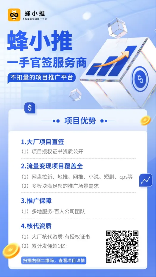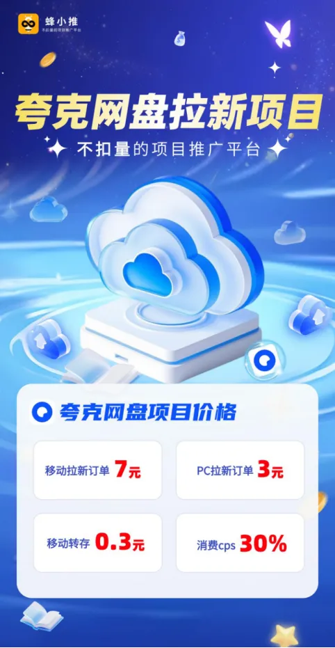 夸克网盘推广收益含三部分:拉新移动端7元/人,PC端3元/人;转存0.3元/次;会员分成30%。选择官方授权一级服务商“蜂小推”获取推广权限,可享佣金透明、结算稳定、数据精准归因,避免佣金被扣、数据断层风险。