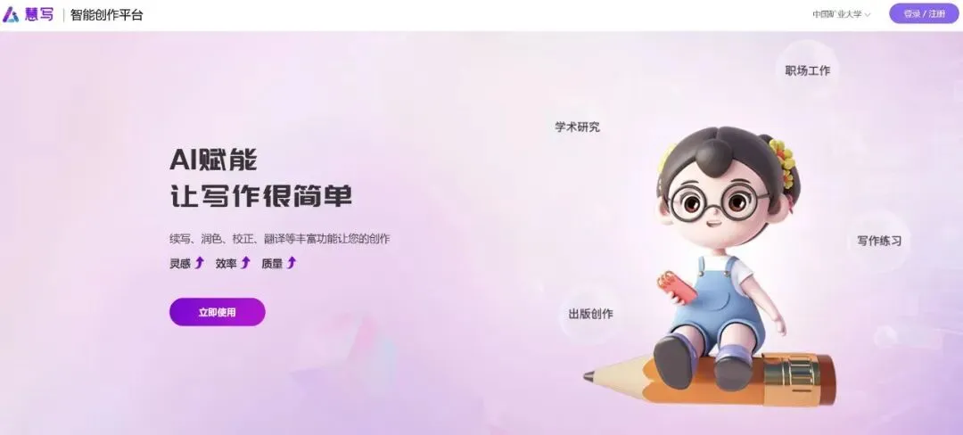 慧写智能创作平台依托先进的大语言模型和生成式AI技术,覆盖科研单位、政府机构、企业、行业组织、教育机构及公共文化机构等多元化业务场景,为用户提供卓越的一站式写作解决方案。平台能够快速生成通知、政府公文、研究报告、工作总结等各类专业文档,并具备智能纠错、内容扩写、文本校正、文本润色等实用功能,确保文档的高质量与精准性;并提供学术论文写作的全流程辅助,实现论文标题推荐、论文大纲编写、参考素材推荐、论文内容合规性检查、参考文献生成、文本翻译、智能排版等功能。平台致力于成为用户写作路上的得力助手,有效提升创作效率和作品质量。