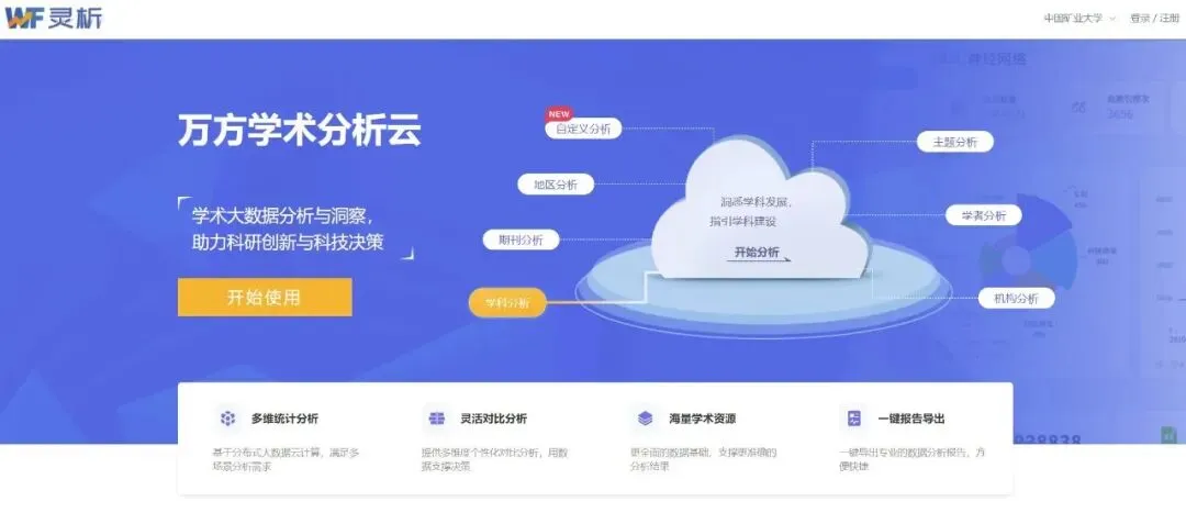 “灵析-万方数据学术大数据分析系统”依托万方知识服务平台的海量学术资源和第三方数据,利用大数据、知识图谱和可视化技术,针对主题、学者、机构、学科、期刊、地区等科研实体,提供多维度文献计量、个性化对比分析、智能化文献推荐、专业性报告导出等服务。另外,也支持对用户本地数据进行可视化分析。支持万方格式(将本地数据转为万方数据格式)、WOS格式、Scopus格式的数据上传,可以对万方数据与用户本地数据合并分析,保证分析结果的精准性。帮助科研人员轻松把握所关注主题的研究现状、监测与分析学者/机构的学术产出及科研能力、跟踪学科领域的发展动态、研究期刊的学术影响力、定位和分析地区的科研水平,为科学研究、科研决策、学科建设等提供数据支持和科学解决方案。
