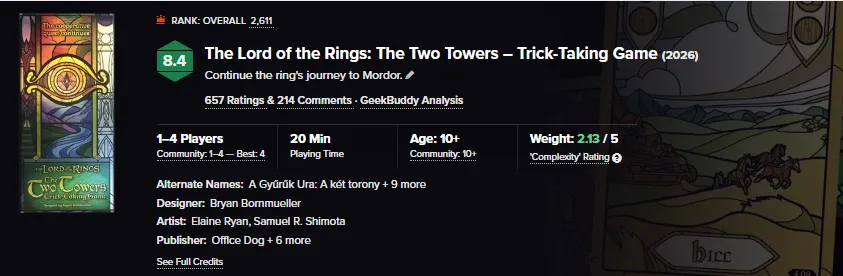 2025年年初,asmodee集团旗下出版社Office Dog通过推出基于《魔戒》原著改编的吃墩类卡牌游戏《魔戒同盟》赢得了来自玩家的如潮好评,至今依然长期在BGG热度以及畅销榜单长期占有一席之地,整体表现堪称现象级: