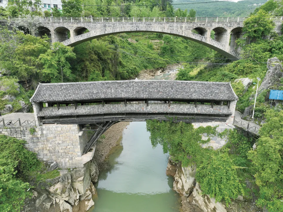 青山怀抱,流水穿绕,桥梁与廊屋珠联璧合,长桥饮涧青云中,氤氲着文化记忆与缕缕乡愁。