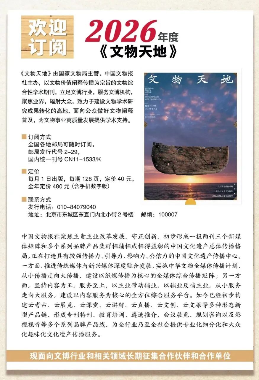 本公号刊载的作品(含标题及编辑所加的版式设计、文字图形等),未经中国文物报社授权不得转载、摘编、改编或以其他方式使用,授权转载的请注明来源及作者。作者投递至本社社属平台的稿件,包括文字、图片、音视频等,视为作者承诺其享有相应著作权。如发布后有侵权行为,后果由作者本人承担。中国文物报社1989年于北京组建,是国家文物局主管的中央文化企业(司局级),全国文物行业唯一具备新闻资质的媒体单位。作为文物宣传工作的主力军,承担着文物舆论引导、新闻宣传、成果展示、知识普及和文化传播等职责。主要负责《中国文物报》编辑出版,国家文物局政府网站、“国家文物局”微信公众号运维管理,中国文物报社所属网站及新媒体的运维拓展等工作。