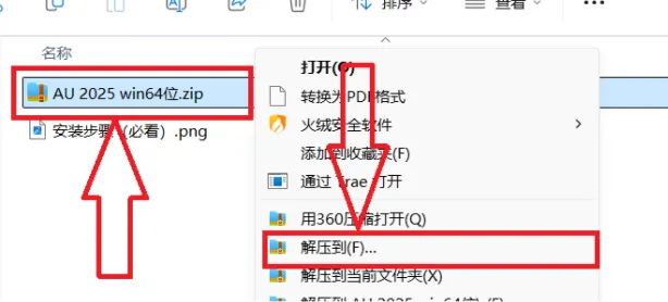 1.找到下载好的【AU 2025】文件夹双击进去,鼠标右击【AU 2025 win64位】软件的压缩包,选择解压。⚠️ 重要提示:无法解压文件?没有解压软件? 点击【解压软件】查看指引,获取免费解压工具! 👉 获取方式:公众号后台回复【解压软件】,立即获取: 适配设备的解压软件安装包。