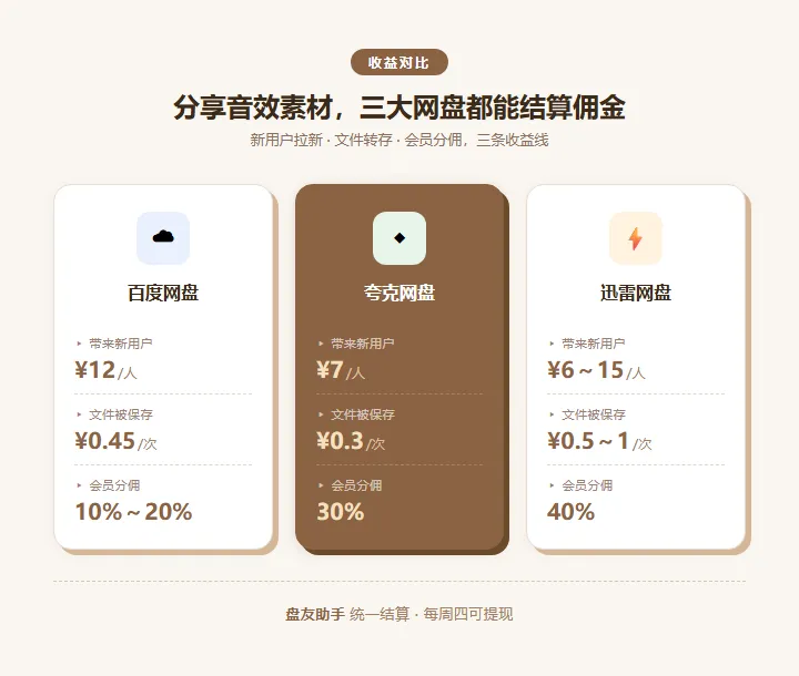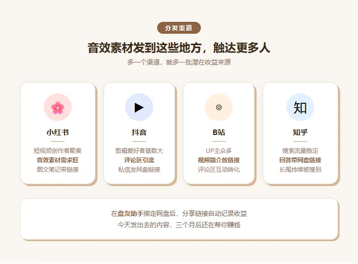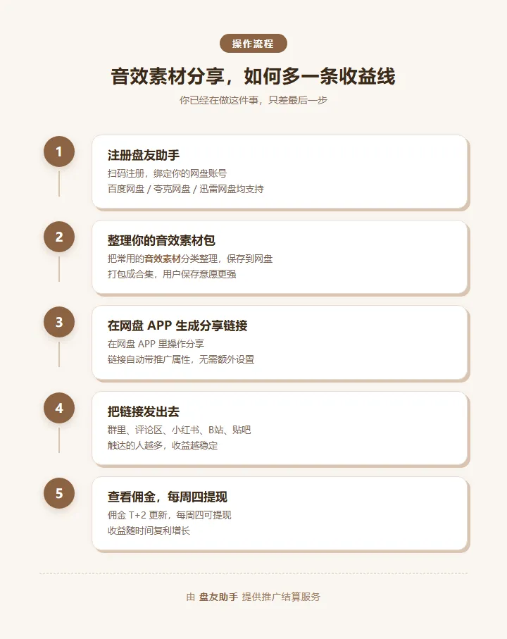 「转场音效合集」「游戏音效包」「综艺综效库」「电影感环境音」……这个动作,你已经不知道做了多少次了 但你可能从来没想过,这个动作本身,可以让你赚钱一、那个「自己取」的动作,是怎么赚到钱的百度网盘、夸克网盘,都在悄悄做一件事——花钱请人帮它们拉用户你通过网盘分享了一个音效素材包,对方点开链接,把文件保存到了自己的网盘 这一个保存动作,就能给你结算一笔佣金如果对方还是第一次注册网盘的新用户——更好,收益更高这不是什么隐秘操作,是网盘平台的官方推广机制,跟你在某宝点进一个链接然后发现有返利,是同一个逻辑只不过你之前一直在做这件事,只是没有绑定推广资格,所以钱白白溜走了 每一次「发给朋友自己取」,都是一次没有被记录的收益二、分享音效素材,这个场景天然适合一套「电影感环境音」,你今天分享出去,三个月后依然有人在搜、在下载、在保存每天都有新的剪辑学员,每天都有新开的账号,每天都有人开始系统学习剪辑他们第一件事就是找素材——音效包,是所有人的必需品你今天整理一套「100个高质量转场音效」,发到网盘里,做好分类,写清楚描述老用户保存,百度给¥0.45,夸克给¥0.3看起来不多,但你分享的不是一个文件,你积累的是一个持续运转的素材库三、怎么把这件事做起来绑定之后,你在网盘APP里正常分享链接,系统会自动把推广属性附在链接上,别人保存,佣金自动结算到你的账户第二步,按提示绑定百度网盘、夸克网盘(绑一个还是多个都行)第三步,在网盘APP里整理你的音效素材,生成分享链接第四步,把链接分享出去——发到剪辑交流群、发到朋友、发到你的社群第五步,等佣金数据更新(T+2结算),每周四可以提现 绑定之后,你之前那个「发给朋友自己取」的习惯,就自动变成了有收益的行为四、想做得更好,这一招很有效B站上传一个「100个免费音效素材,直接保存」的视频在视频或笔记里放上网盘链接,感兴趣的人点进去就能保存 你发出去的一篇笔记,可能三个月后还在持续被新人搜到、保存这就是这件事的核心价值:不是一次性的人力,是可以持续回报的内容资产今天整理好,往后一直在为你工作前两周,你可能只是赚个零花钱——几十块,能喝两杯咖啡但如果你认真把音效素材整理好,发到公开平台,铺开触达面这种感觉,和你剪了一整天视频、累得半死的感觉,是完全不一样的 你没有多做什么,只是在你已经做着的事情里,多开了一条收益线赚多赚少,取决于你愿意铺多宽但有一件事是确定的——你今天发出去的那个音效包,不会消失,它会一直在那里帮你转这才是我想说的重点:10倍的努力是手段,找到一件能自己运转的事,才是目的音效素材这件事,你本来就在做感兴趣的可以从这里了解具体操作流程,扫码注册,完全免费