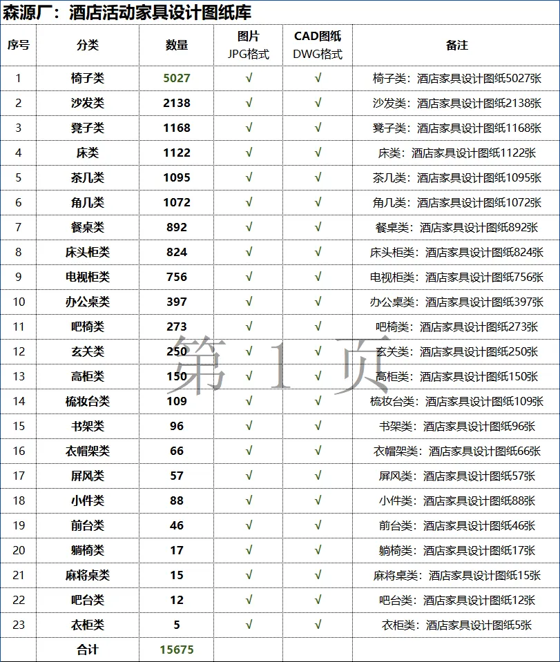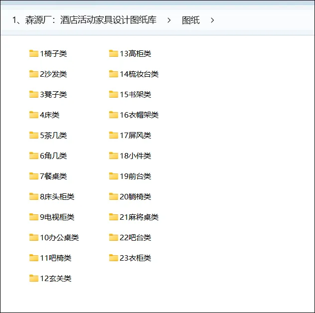 《森源厂》酒店活动家具设计图纸库 目录数量清单截图:23大分类:《森源厂》酒店活动家具设计图纸库 资料截图