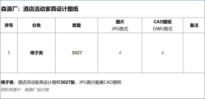 《椅子类:酒店活动家具设计图纸5027张》,图片配套CAD图纸资料来源于:森源厂设计部配套CAD图纸文件格式:Dwg,AutoCAD2012软件以上版本可打开图片文件格式:JPG,电脑图片软件可打开