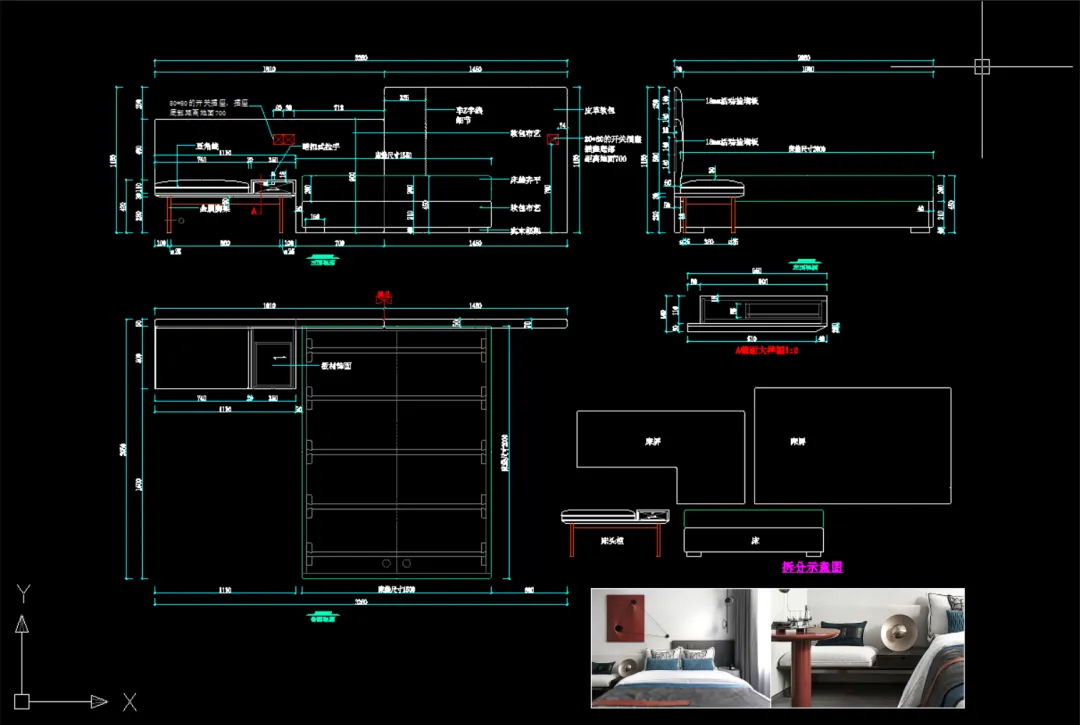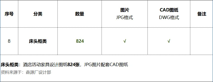 《床头柜类:酒店活动家具设计图纸824张》,图片配套CAD图纸资料来源于:森源厂设计部配套CAD图纸文件格式:Dwg,AutoCAD2012软件以上版本可打开图片文件格式:JPG,电脑图片软件可打开