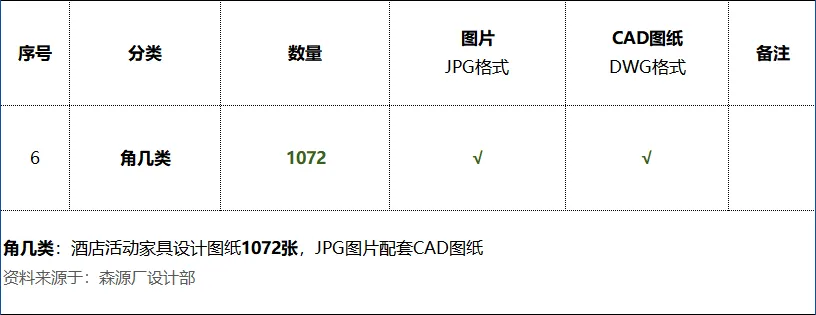 《角几类:酒店活动家具设计图纸1072张》,图片配套CAD图纸资料来源于:森源厂设计部配套CAD图纸文件格式:Dwg,AutoCAD2012软件以上版本可打开图片文件格式:JPG,电脑图片软件可打开