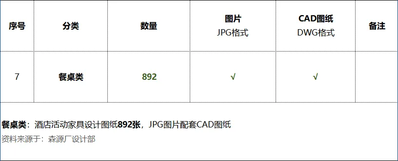 《餐桌类:酒店活动家具设计图纸892张》,图片配套CAD图纸资料来源于:森源厂设计部配套CAD图纸文件格式:Dwg,AutoCAD2012软件以上版本可打开图片文件格式:JPG,电脑图片软件可打开