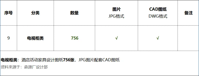 《电视柜类:酒店活动家具设计图纸756张》,图片配套CAD图纸资料来源于:森源厂设计部配套CAD图纸文件格式:Dwg,AutoCAD2012软件以上版本可打开图片文件格式:JPG,电脑图片软件可打开