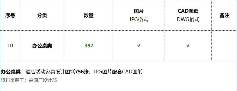《办公桌类:酒店活动家具设计图纸397张》,图片配套CAD图纸资料来源于:森源厂设计部配套CAD图纸文件格式:Dwg,AutoCAD2012软件以上版本可打开图片文件格式:JPG,电脑图片软件可打开