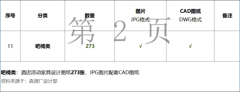 《吧椅类:酒店活动家具设计图纸273张》,图片配套CAD图纸资料来源于:森源厂设计部配套CAD图纸文件格式:Dwg,AutoCAD2012软件以上版本可打开图片文件格式:JPG,电脑图片软件可打开