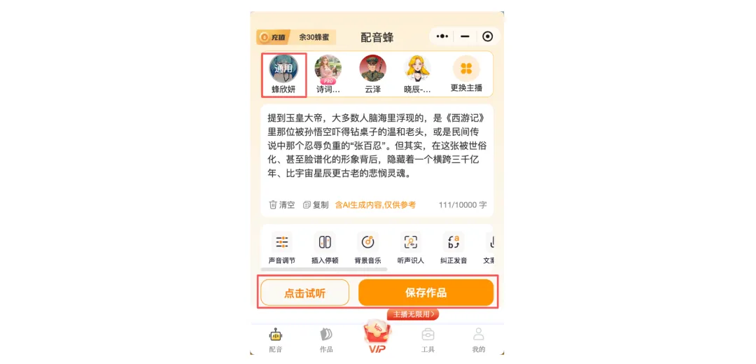 第一步,搞定配音。找个配音小程序,选那种类似“蜂欣妍”的纪录片音色,厚重感立马就出来了。