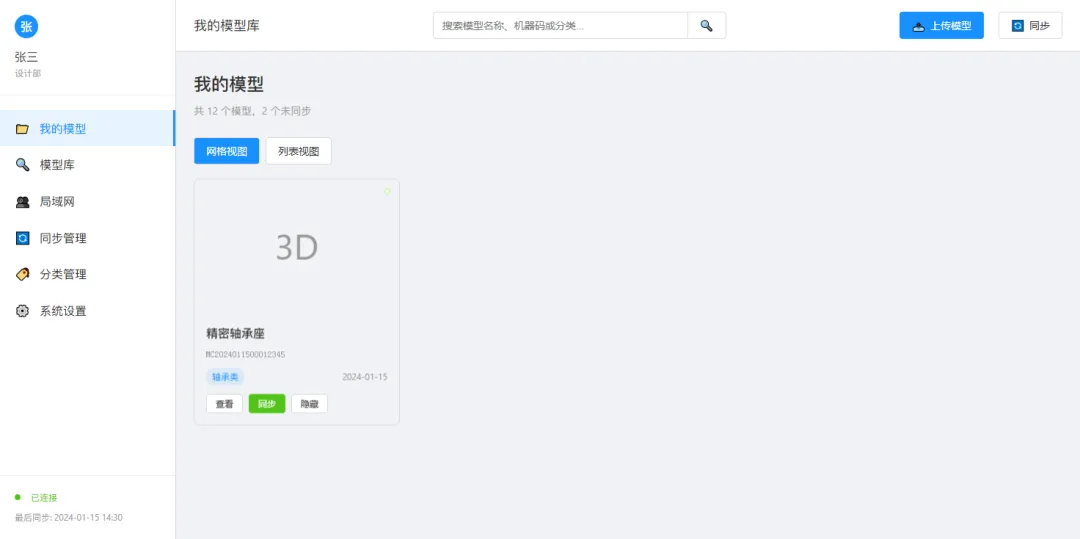 - 上传:把本地 3D 模型传到服务器,也能只存在本地;上传时要填模型名称、分类,设个临时密码,系统会自动给模型生成唯一的 18 位 “数字身份证”(机器码),还会绑定当前操作的电脑