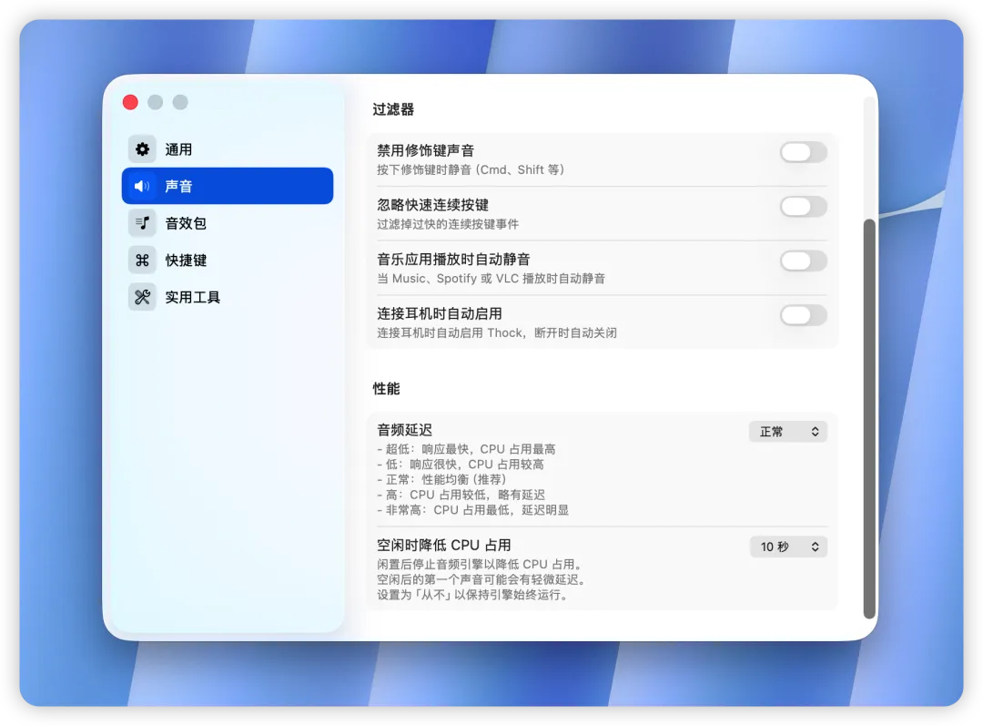 打字音效会普遍存在一定的音频延迟,长时间不打字再进行打字的前几秒会不出声,这个软件就可以通过调节性能模式来获得更低的延迟,总体来说会比Tickeys的延迟更低一些,不过对CPU的占用也会更大。
