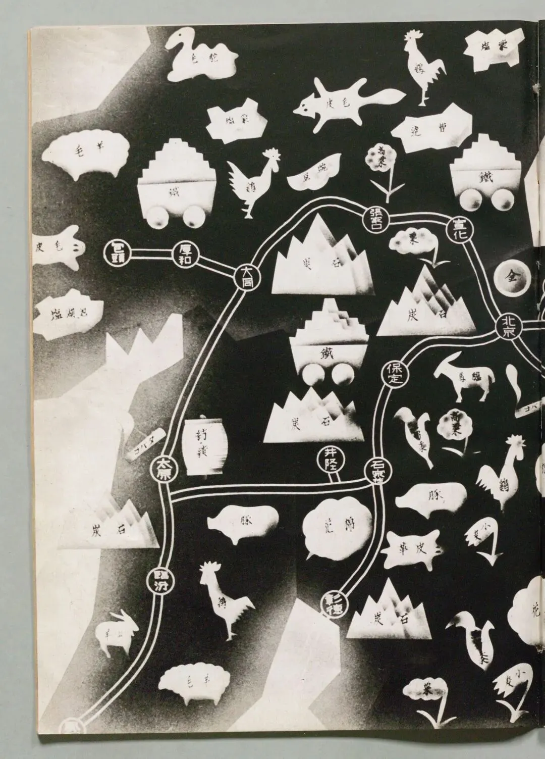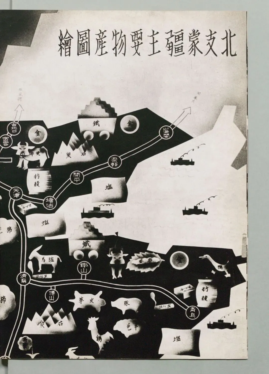 北方辽阔的牧区是日军搜刮的重点。图中用羊、马、骆驼、鸡鸭等动物形象,标注了包头、归绥(呼和浩特)周边的畜牧业分布。日军成立“蒙疆畜产公司”,以极低的“公定价格”强制收购,8年间掠夺牲畜超百万头。同时,图中“盐”、“绵丝”(羊毛)、“皮”(皮毛)的标识,对应对盐业、畜毛、皮革的垄断性征收,这些物资被源源不断运往日本,用于制造军服、毛毯及化工原料。