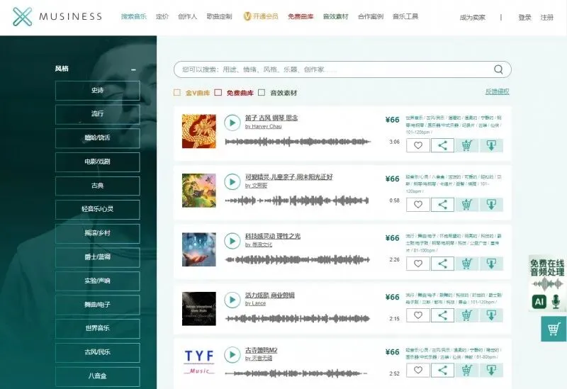 今天把我私藏半年的「一站式创作神器」MUSINESS商用版权音乐网站 musiness.vip分享给你:正版商用版权音乐 + 免费曲库 + 9 个全免费音频工具,从找配乐、到音频后期,一条龙解决所有问题,新手、自媒体、个体户、中小企业全都能用,关键是零成本、零门槛、零侵权!