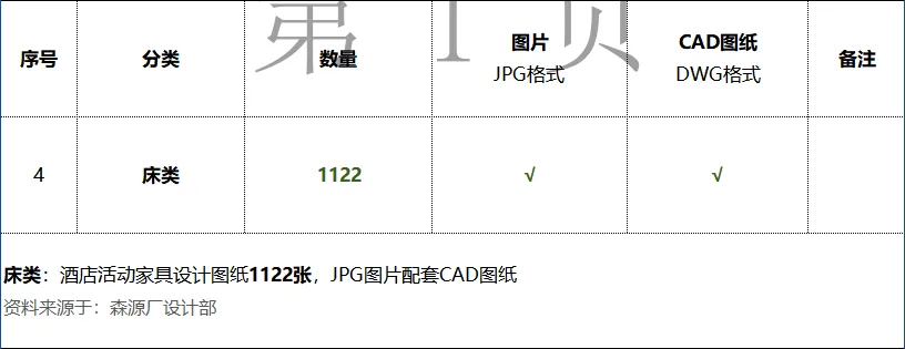 以下是分类中的床类详情《床类:酒店活动家具设计图纸1122张》,图片配套CAD图纸资料来源于:森源厂设计部配套CAD图纸文件格式:Dwg,AutoCAD2012软件以上版本可打开图片文件格式:JPG,电脑图片软件可打开