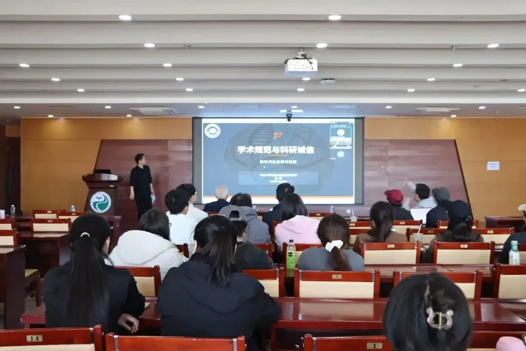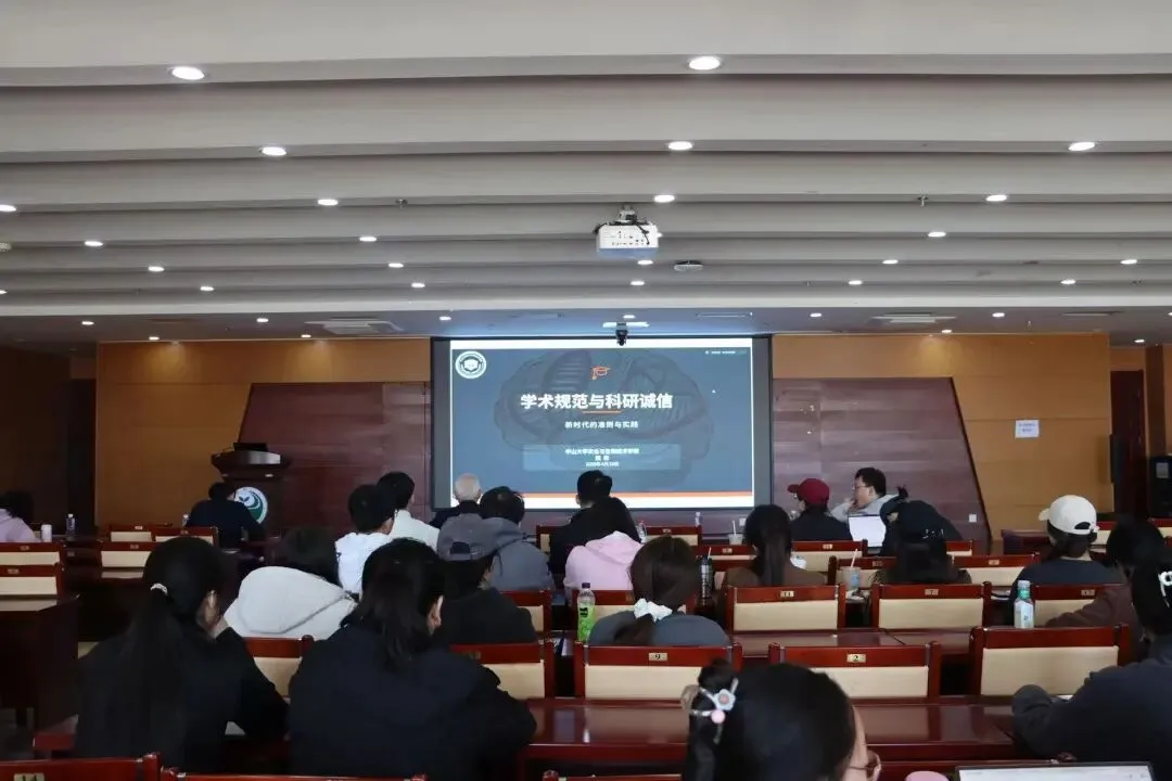 报告会上,魏蜜副教授围绕学术规范与科研诚信展开系统讲解。她指出,当前学术不端事件频发,维护学术底线刻不容缓。她明确了学术诚信的四大原则:诚实守信、尊重原创、合理引用、严谨透明,并逐条解读了七种常见学术不端行为,结合典型案例深刻剖析了学术不端的严重后果。针对日益普及的AI工具,魏蜜副教授提出“黄金三原则”:透明声明、主体责任、人工验证。她还分享了中山大学在论文登记、数据备案、期刊黑白名单等方面的实践经验,并明确本科毕业论文文字复制比不超过20%。她呼吁全体研究生从入学起就扣好学术生涯的“第一粒扣子”,坚守科研底线。