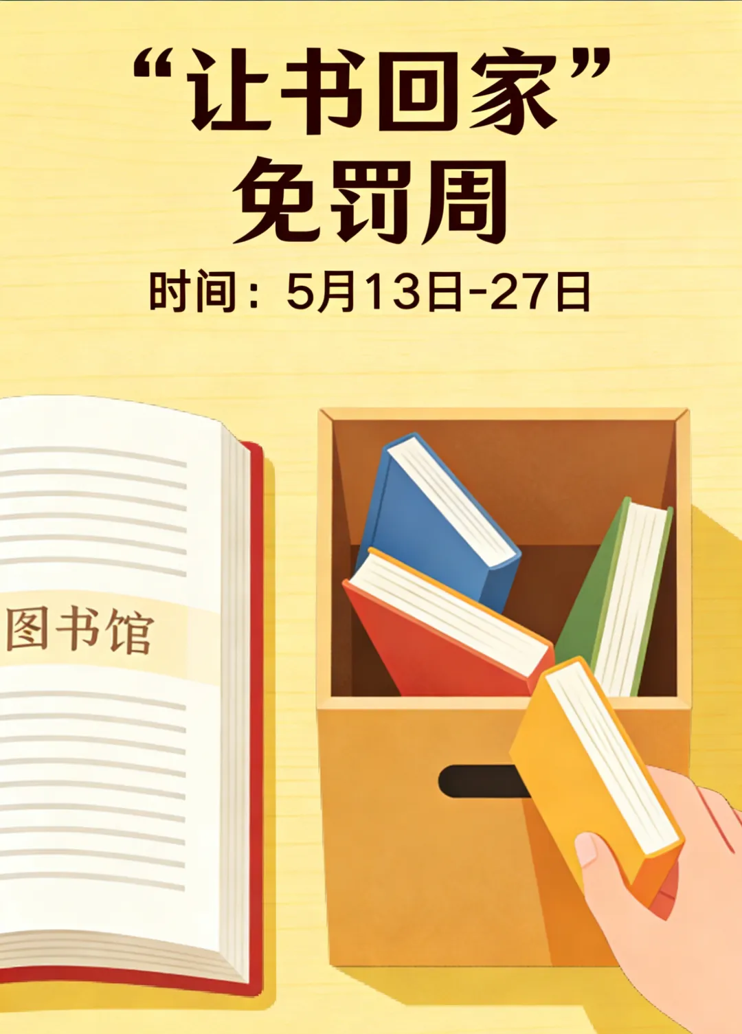 你是不是也有那么几本超期的书,一直忘记还?别担心,这两周,逾期不罚。把滞留在你手里的书送回家,让它们继续流通吧。