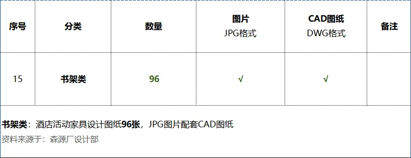 《书架类:酒店活动家具设计图纸96张》,图片配套CAD图纸,资料来源于:森源厂设计部,配套CAD图纸,文件格式:Dwg,AutoCAD2012软件以上版本可打开,图片文件格式:JPG,电脑图片软件可打开