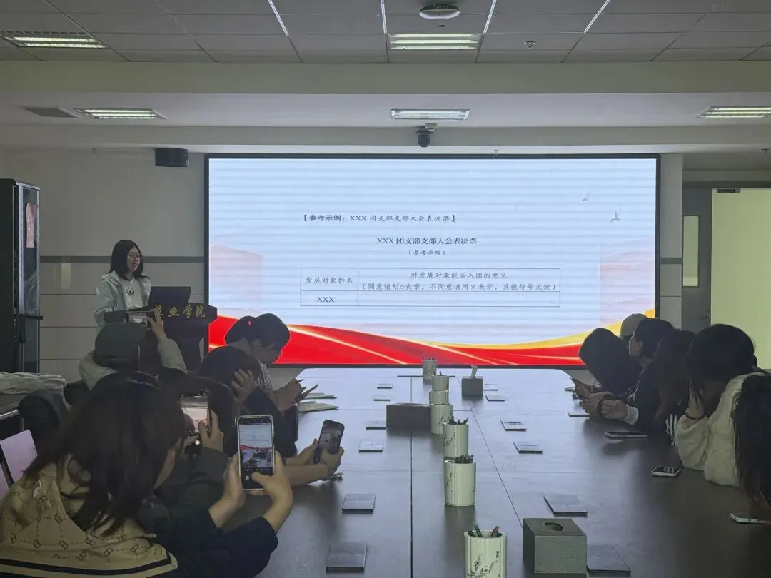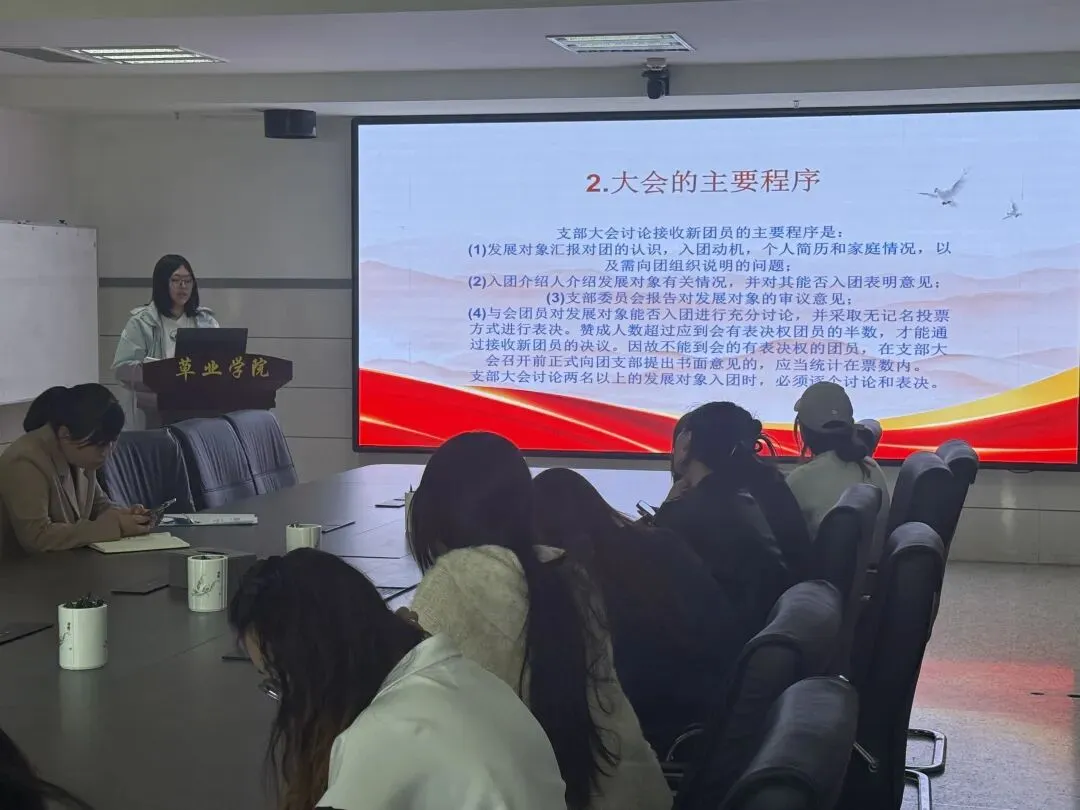 会议伊始,其乐木格老师首先对2026年共青团工作要点进行部署和学习。接着分团委组织宣传部董禹希讲解了团员组织关系转入、转出等操作流程以及发展新团员的具体流程,分团委科创部仲芯葶围绕2026级春季“挑战杯”赛事要求,详细讲解了项目报名流程、材料提交规范及各类注意事项。